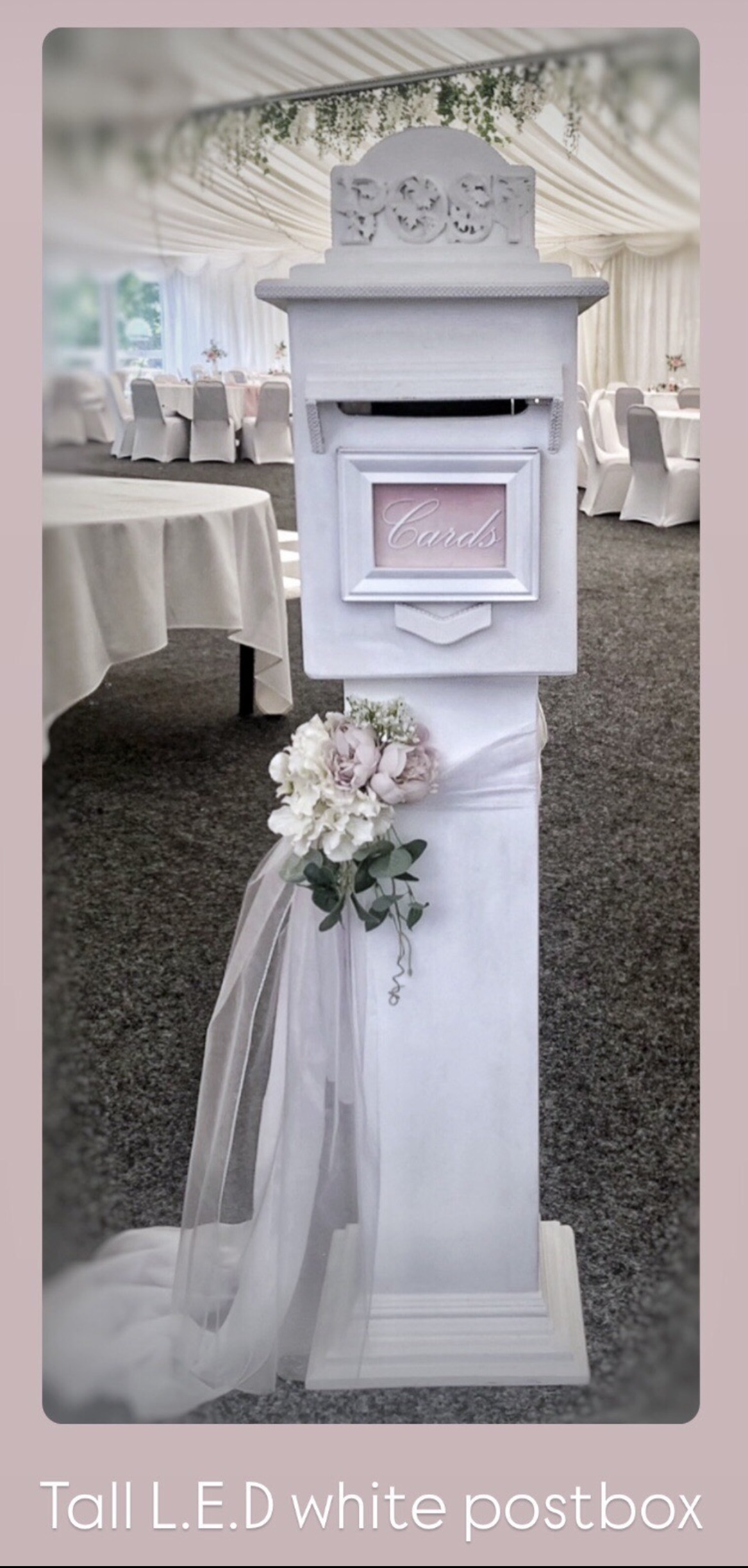Our handmade postbox is unique, and features diamanté touches with subtle LED lighting, draped in organza. Solidly built but elegant with a lockable base that will keep your cards secure and in one place.