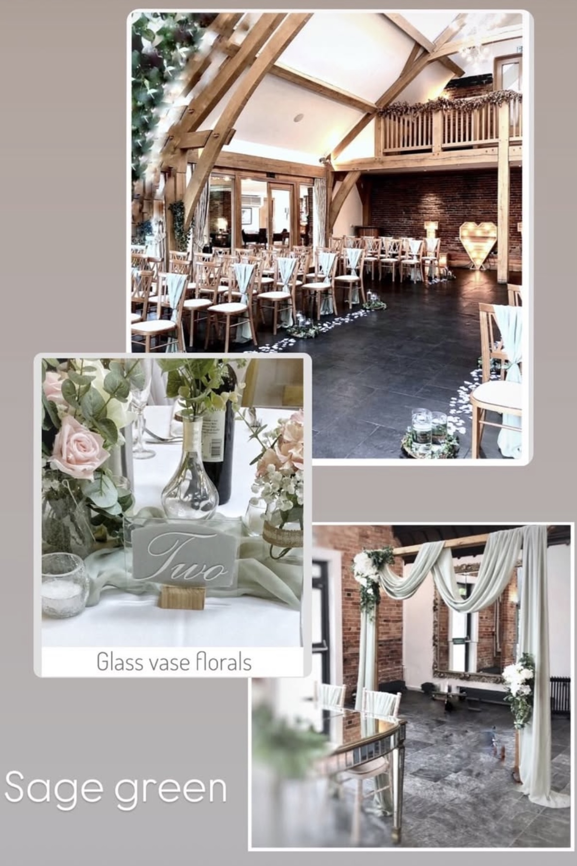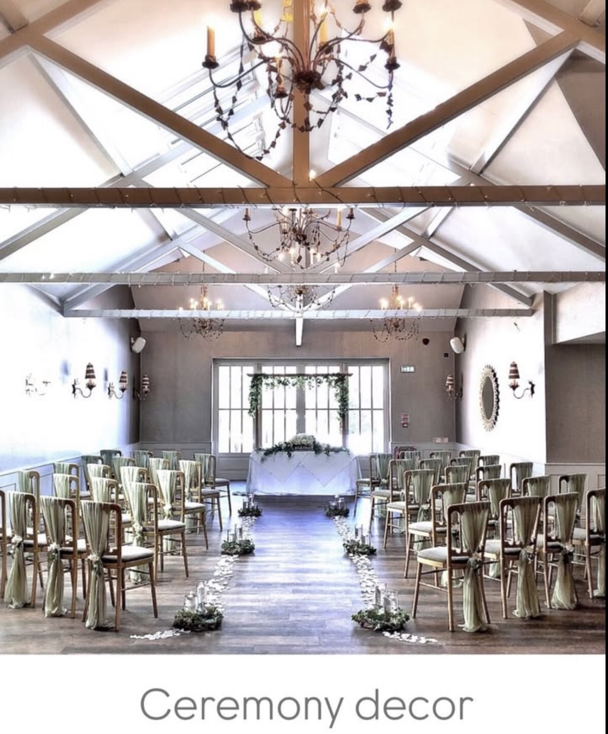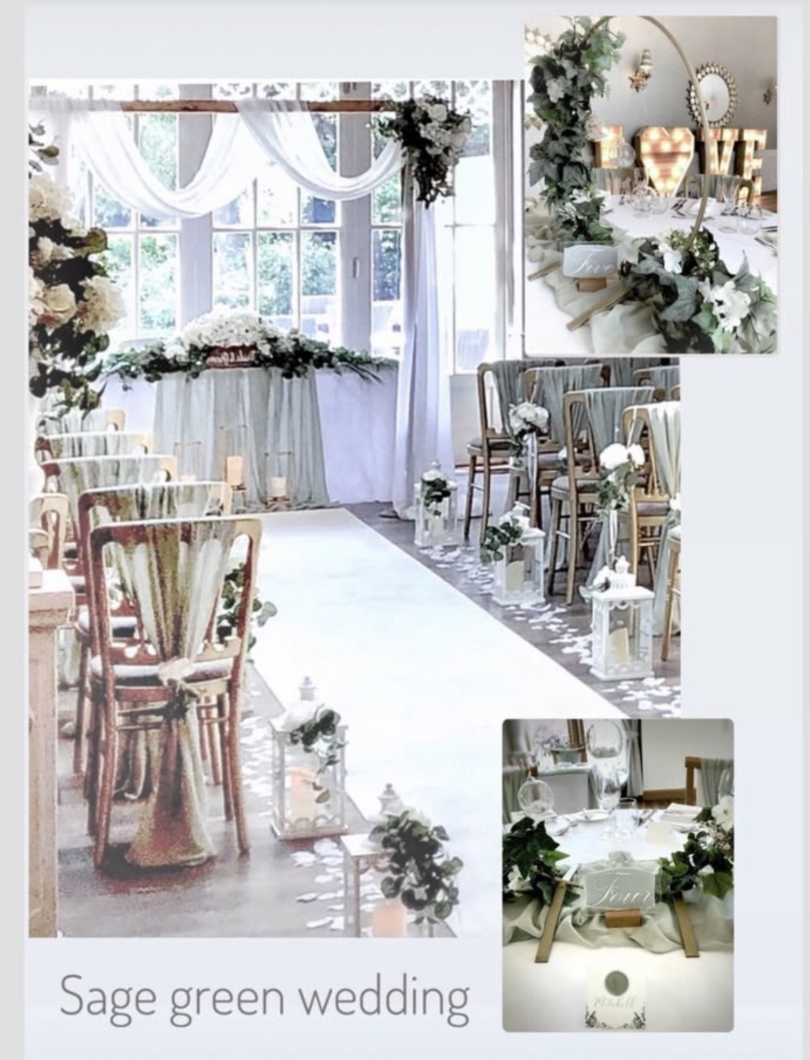 So classy , and a firm favorite , green and white florals, with white chiffon chair drapes