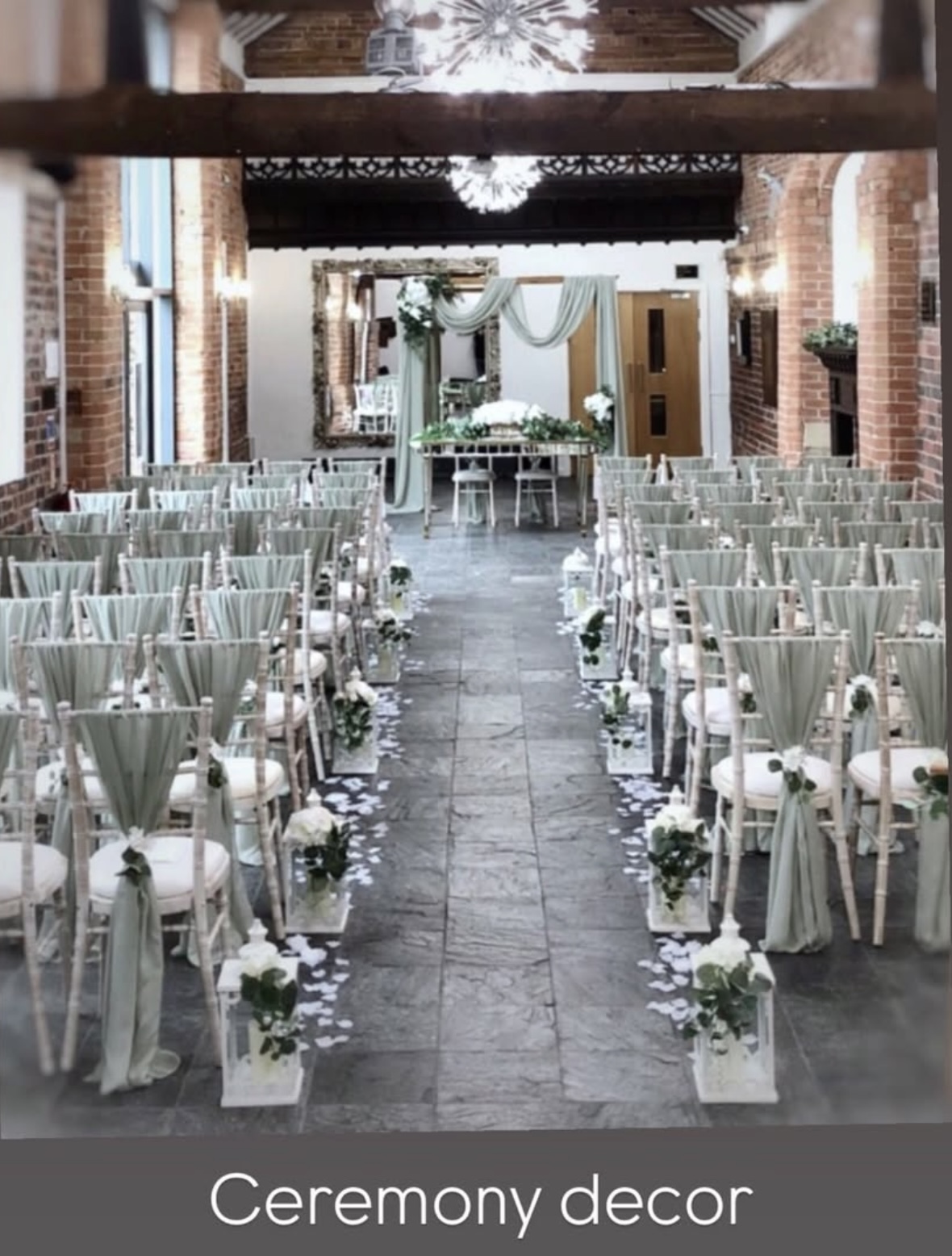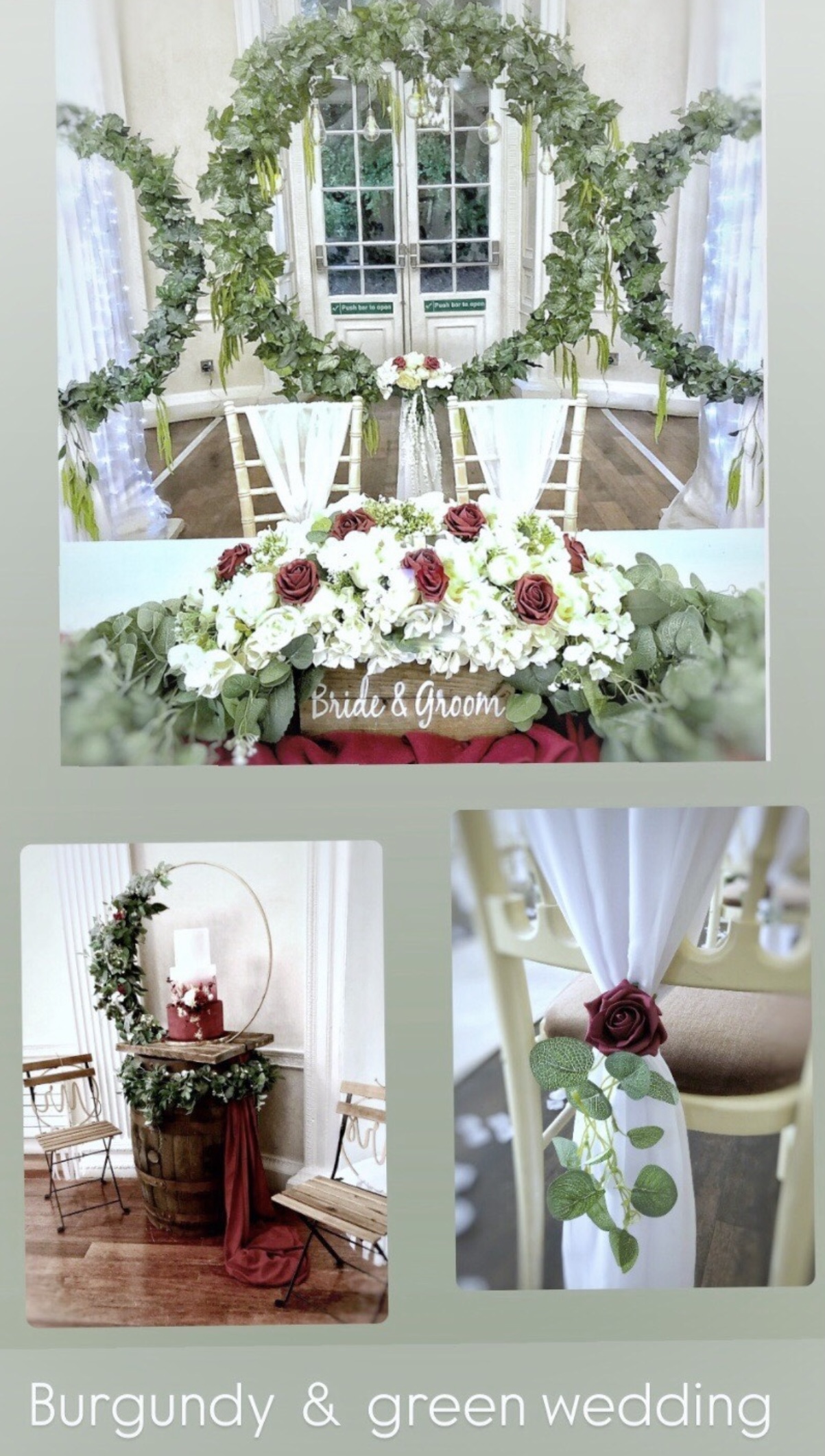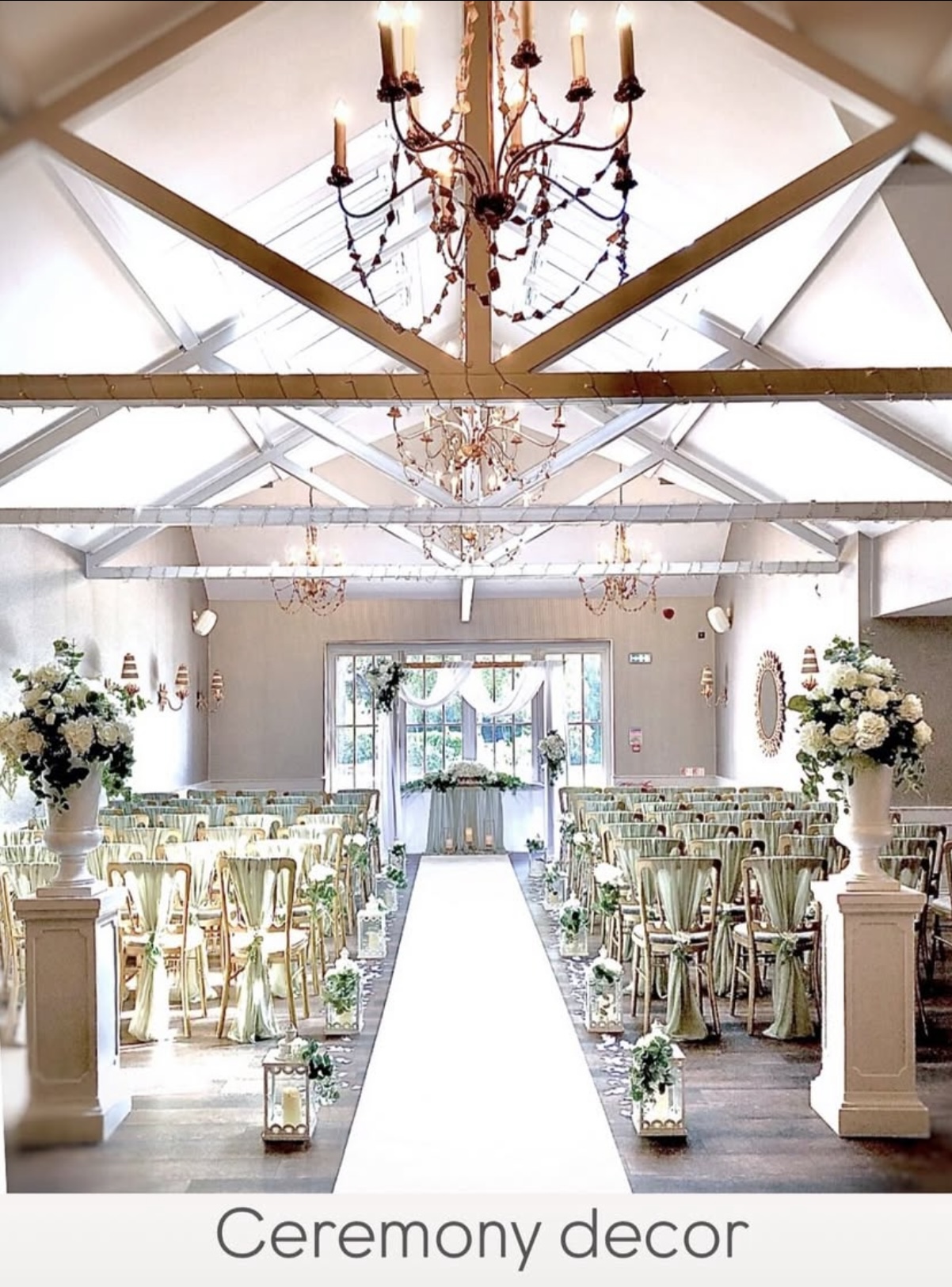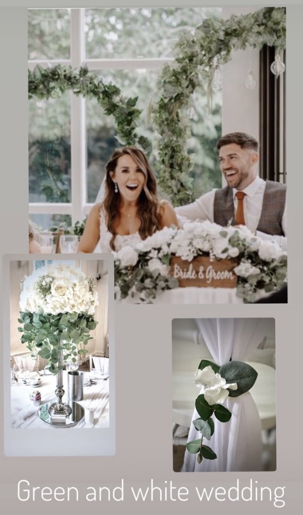 So classy , and a firm favorite , green and white florals, with white chiffon chair drapes