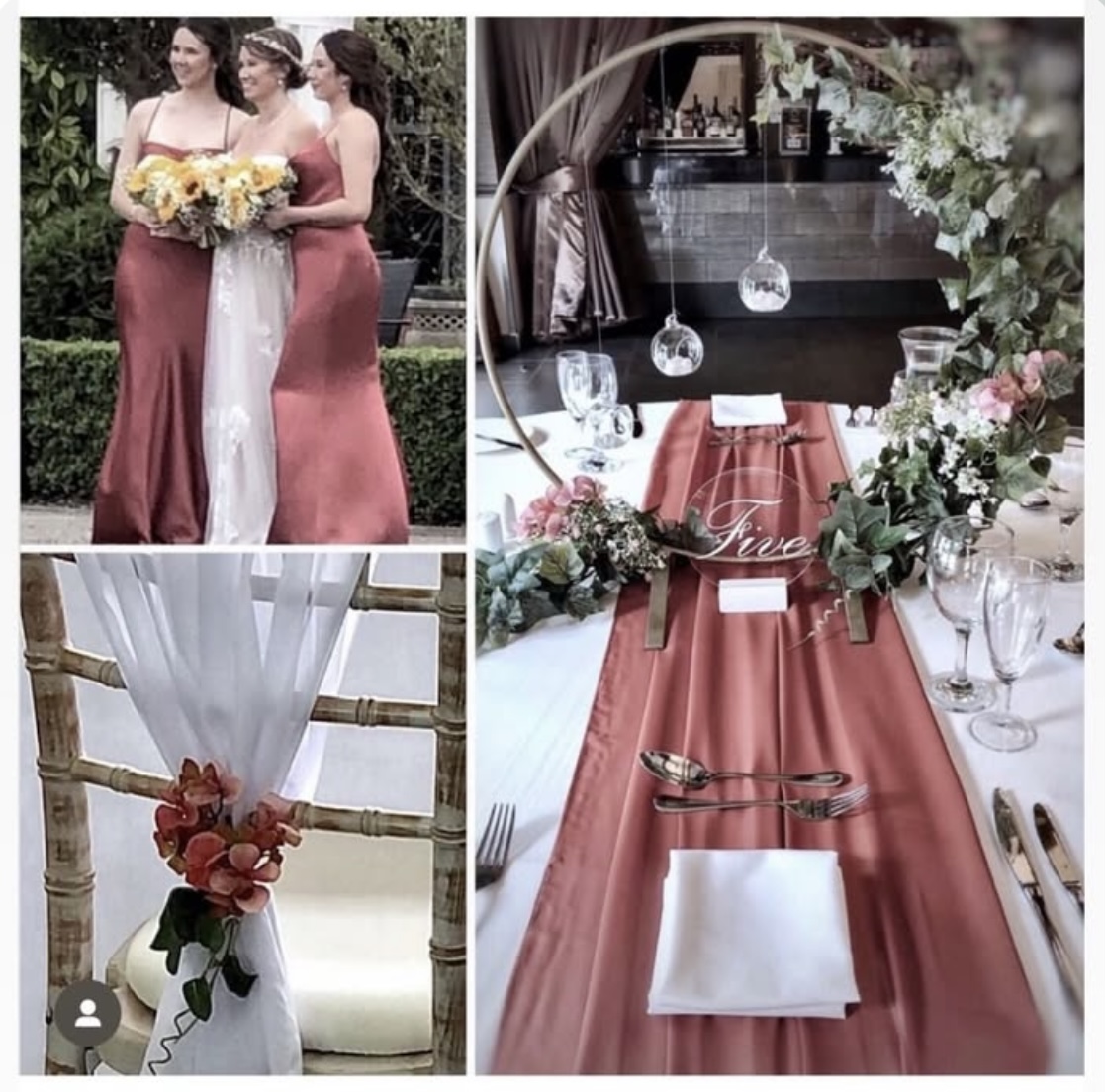 dressed in vintage pink chiffon table runners and matching vintage pink chiffon chair drapes